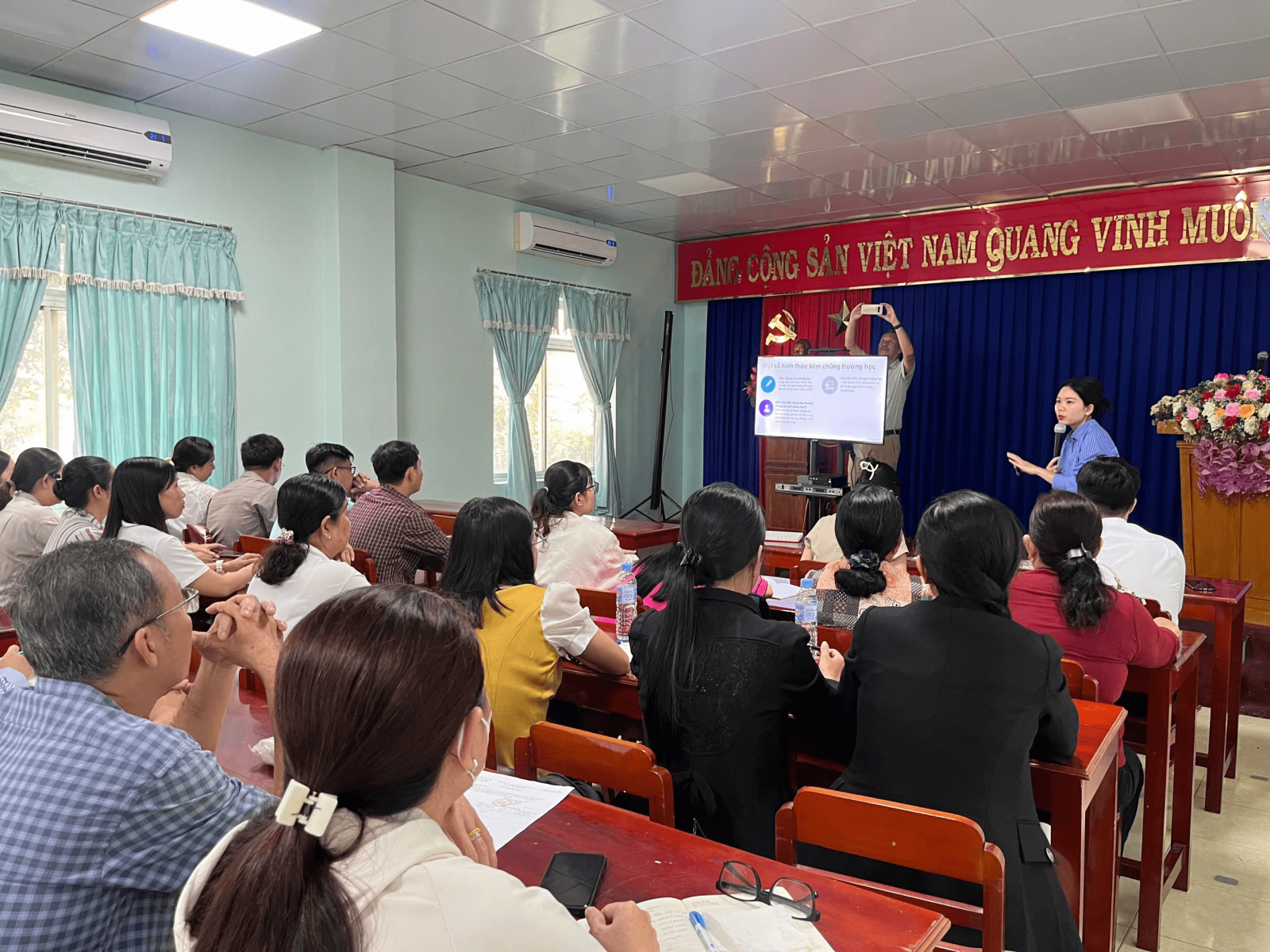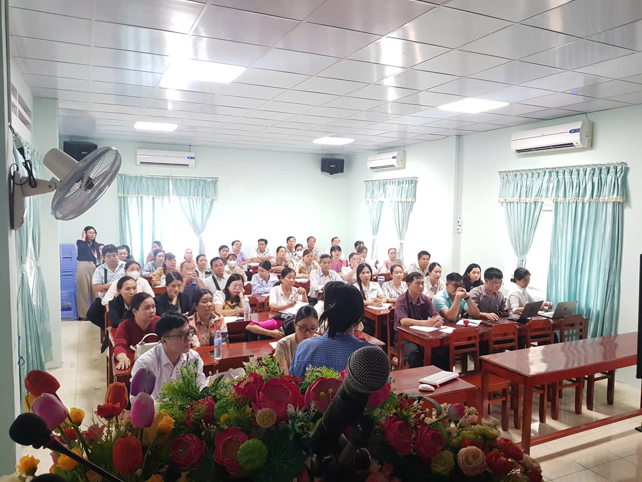 Để nâng cao hiệu quả chuyên môn chương trình tiêm chủng mở rộng (TCMR), sáng ngày 30/9/2025, tại Hội trường, khoa Kiểm soát bệnh tật HIV/AIDS Trung tâm Y tế Châu Phú phối hợp với Trung tâm Kiểm soát bệnh tật tỉnh An Giang tổ chức lớp tập huấn triển khai kế hoạch tiêm chủng bù liều cho trẻ cho các trường mầm non, mẫu giáo, tiểu học khu vực Châu Phú năm 2025, tham dự có hơn 53 cán bộ y tế trường học.
