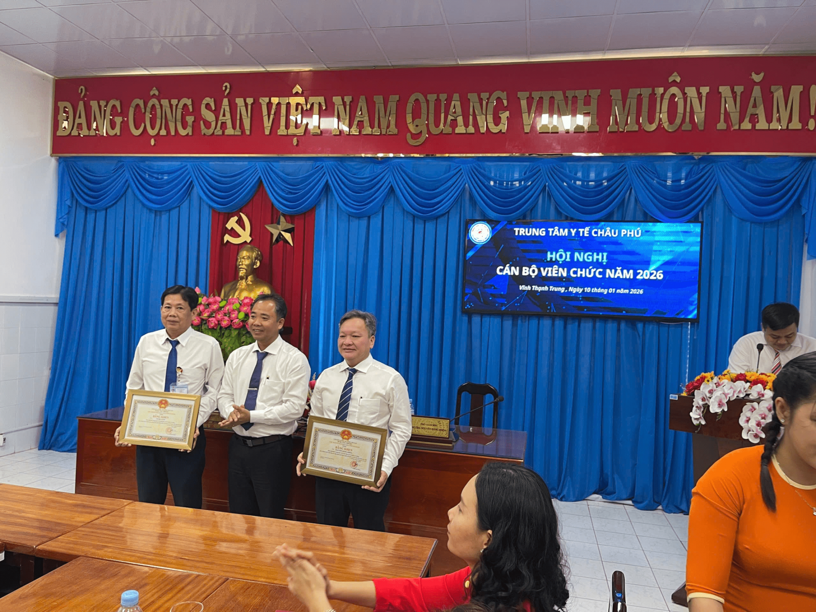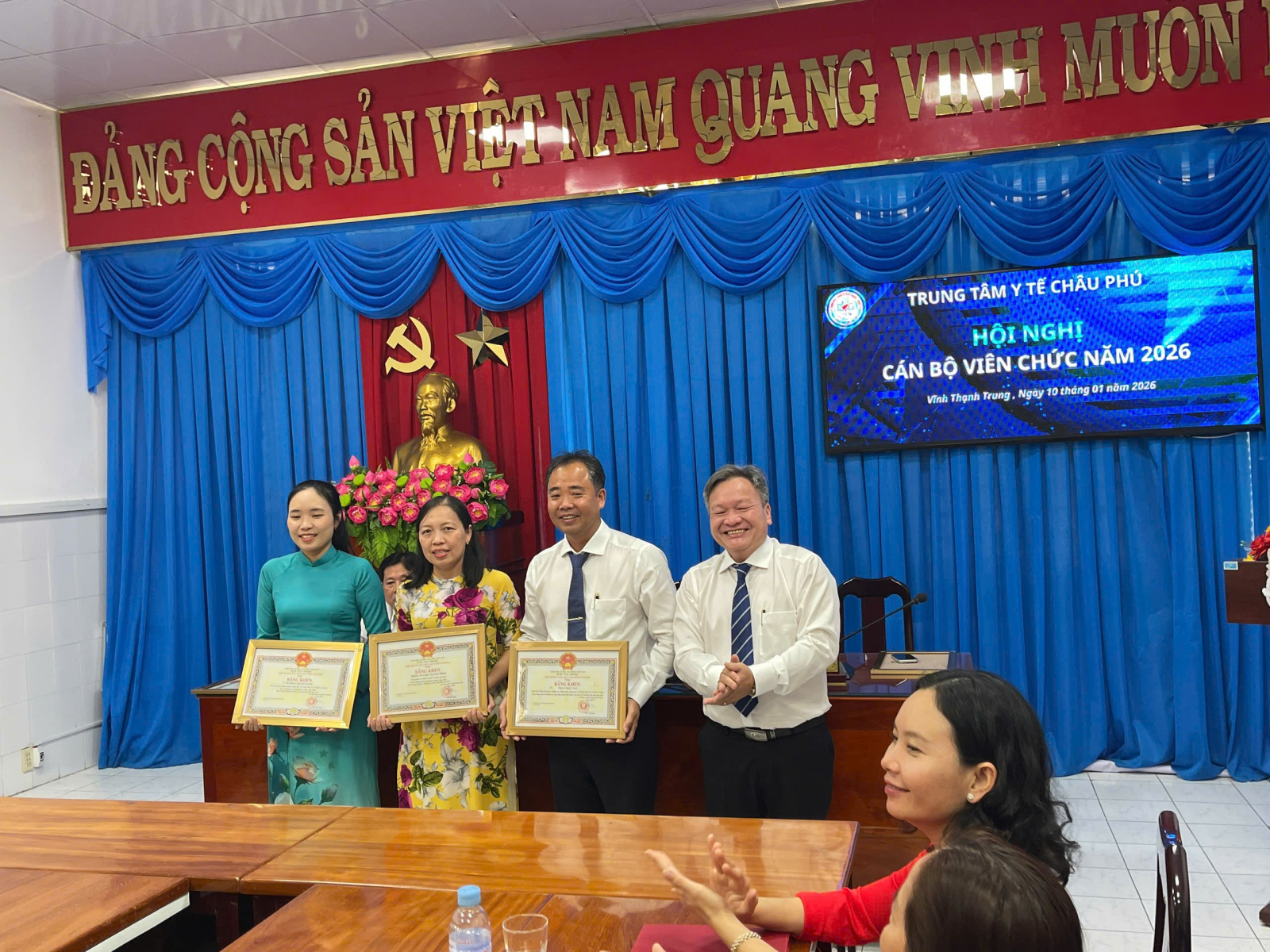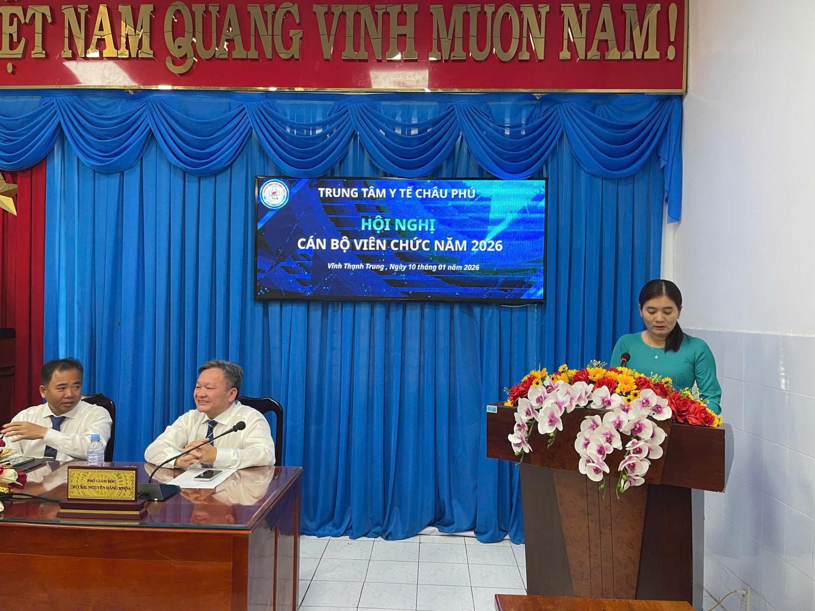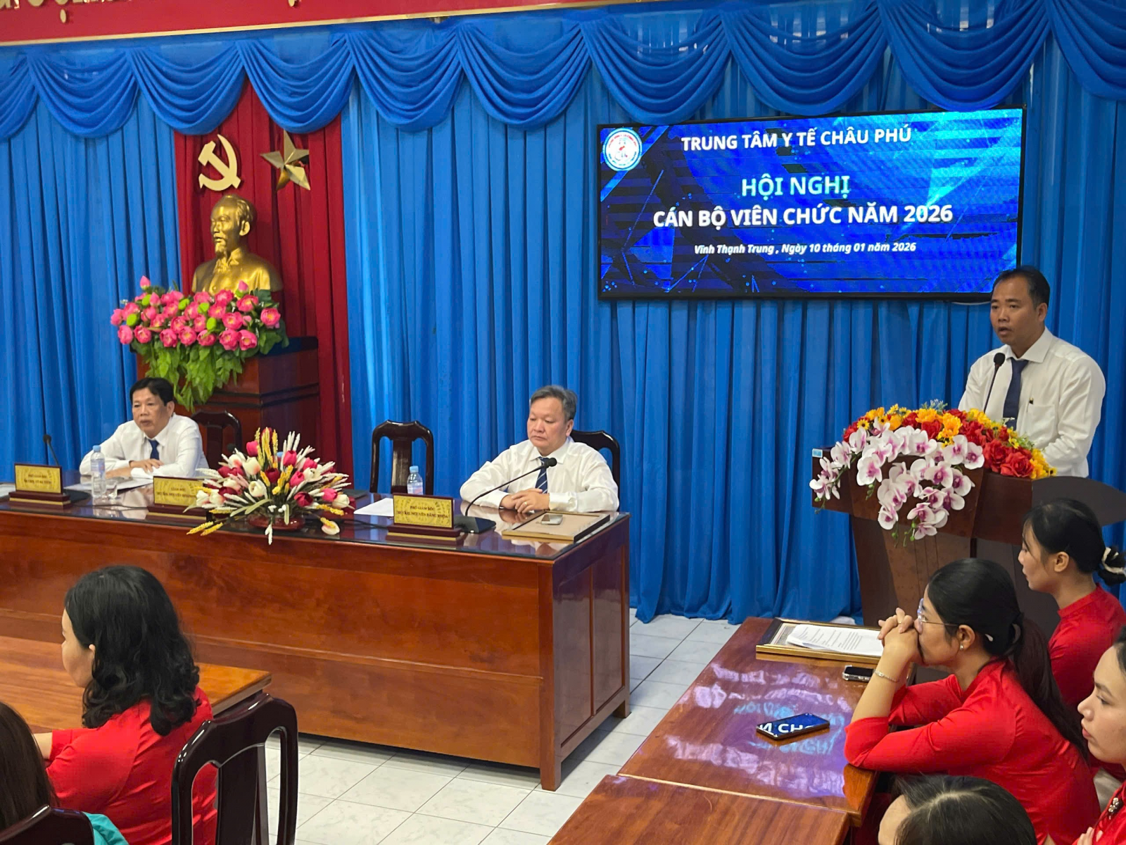 Sáng nay, ngày 10/01 Trung tâm Y tế Châu Phú tổ chức thành công Hội nghị cán bộ, viên chức năm 2026; Đến dự Hội nghị có Giám đốc BSCKII. Nguyễn Hoàng Huy; các Phó Giám đốc BSCKII. Nguyễn Đăng Khoa và BSCKII. Võ Bá Tước; cùng lãnh đạo các Khoa, Phòng, Trạm Y tế và hơn 60 đại biểu đại diện cho toàn thể cán bộ, viên chức Trung tâm Y tế Châu Phú. Tại Hội nghị quan trọng này, các đại biểu đã cùng nhau điểm lại các mặt hoạt động Trung tâm Y tế Châu Phú trong năm 2025 và vạch ra những phương hướng, nhiệm vụ trọng tâm cho năm 2026. Các báo cáo được trình bày tại Hội nghị đã mang đến cái nhìn toàn diện về các hoạt động năm 2025 như: